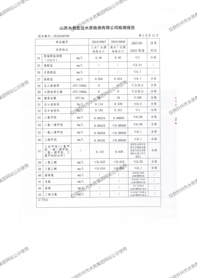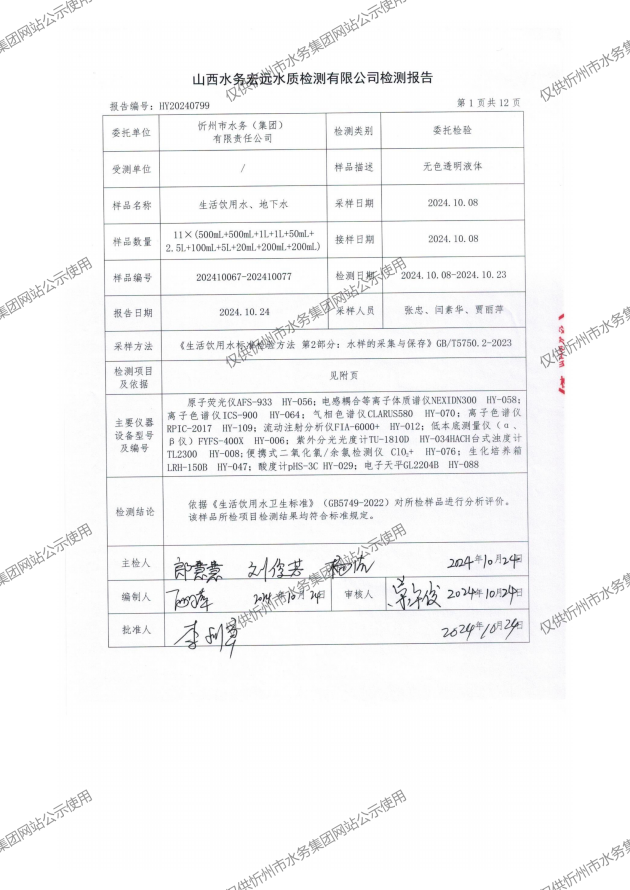 忻州城區公共供水水源水、出廠水、管網水、管網末梢水2024年10月份水質信息公示