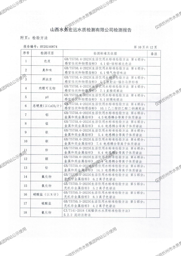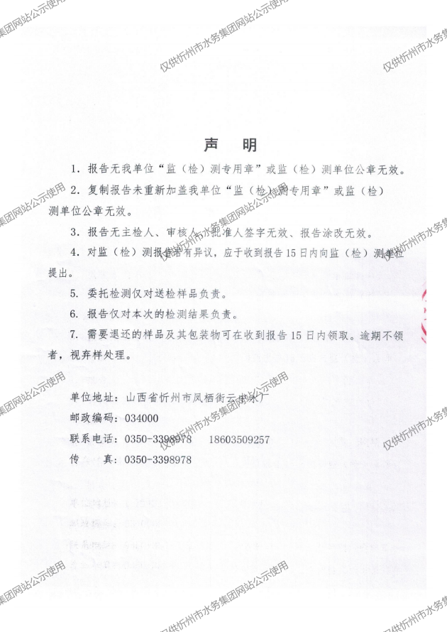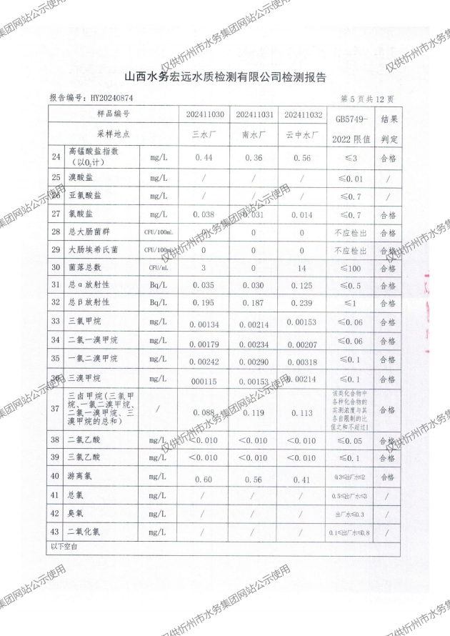 忻州城區公共供水水源水、出廠水、管網水、管網末梢水2024年11月份水質信息公示