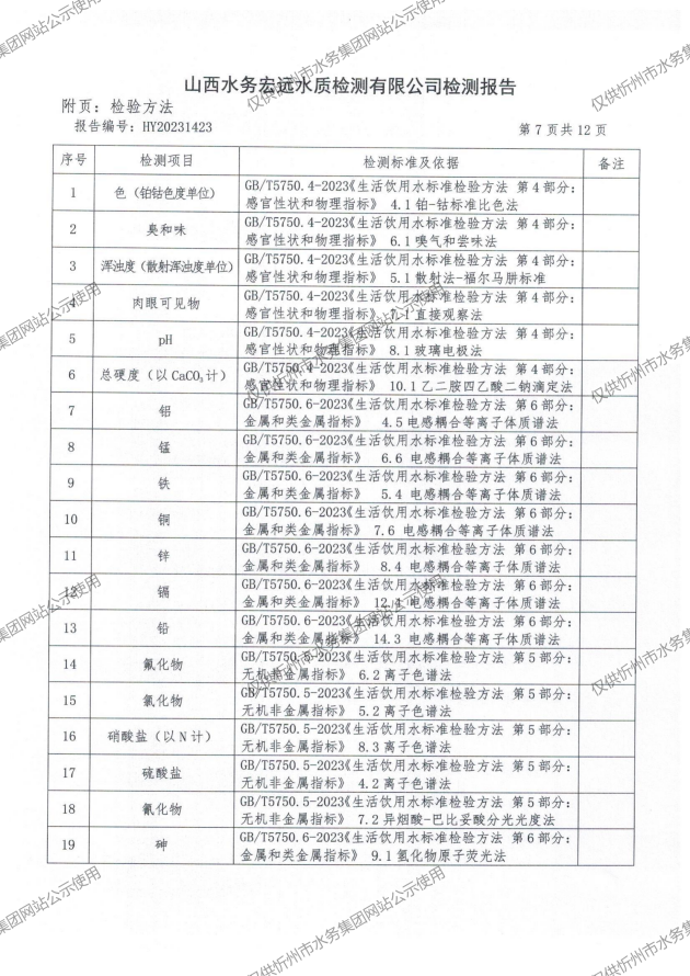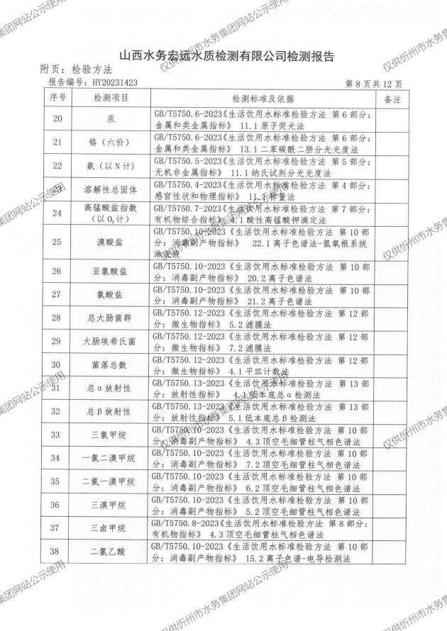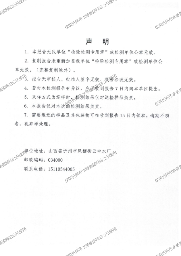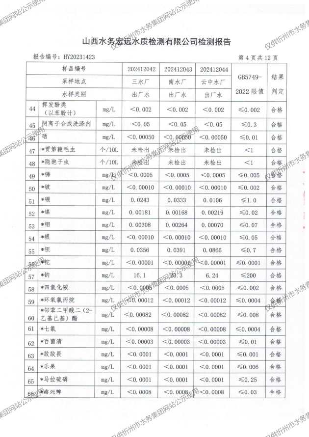 2024年忻州城區公共供水南水廠、三水廠、云中水廠出廠水97項水質全分析